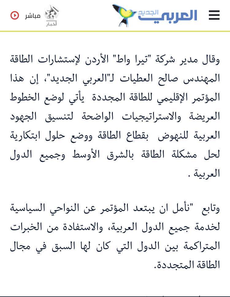 مشاركة شركة تيرا واط الاردن ممثلة برئيس مجلس الادارة المهندس صالح العطيات و فريق الشركة في ورشة الحوار العربي الخامسة للطاقة المتجددة برعاية الهيئة العربية للطاقة المتجددة